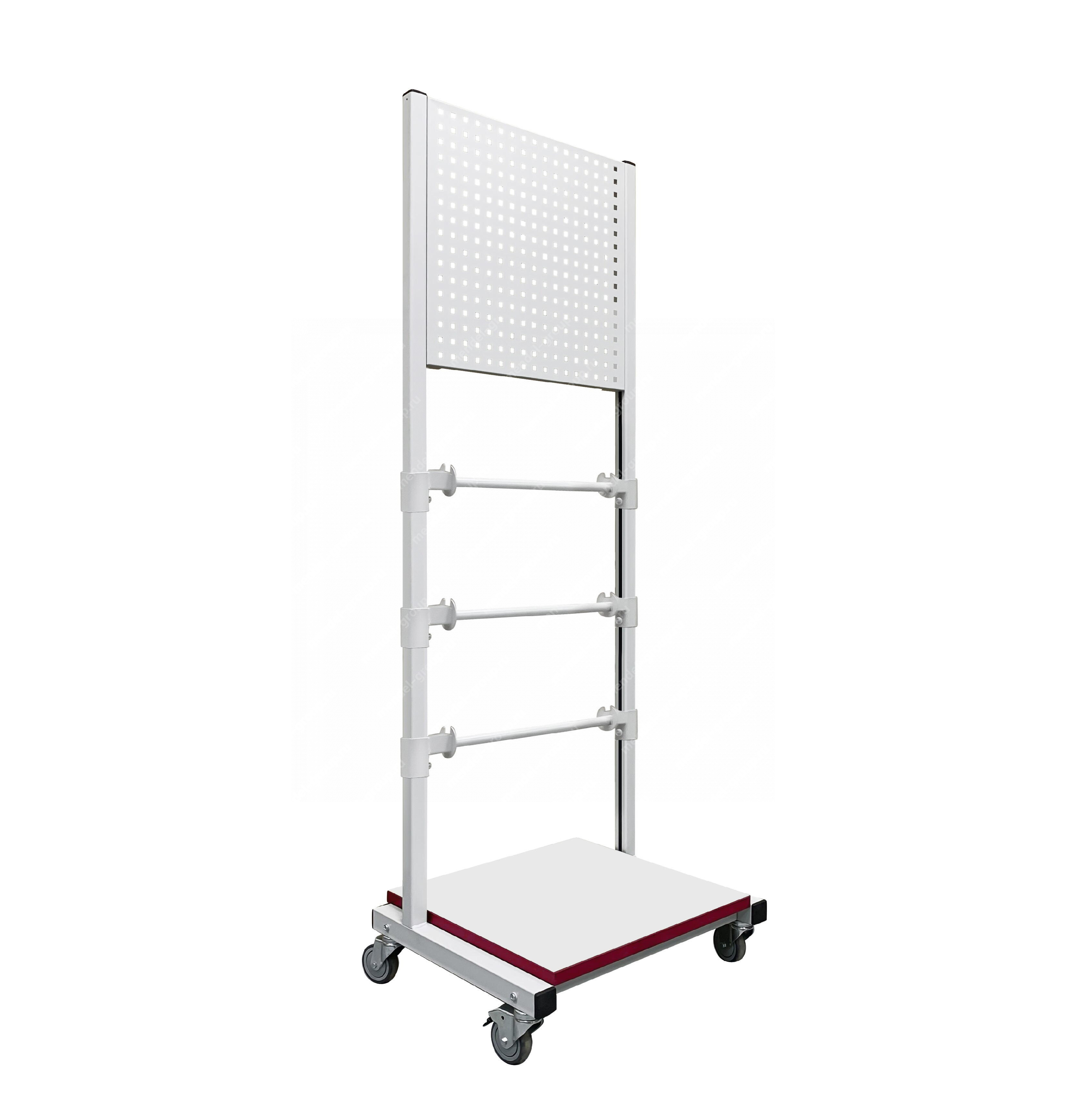 Стойка подкатная универсальная СРТ используется для хранения и перемещения рулонных материалов и инструментов в рабочем пространстве. В стандартной комплектации стойка поставляется в комплекте с панелью перфорированной ППМ и держателями для рулонов (3 шт). Регулировка высоты держателей рулонов осуществляется по боковым стойкам. Конструкция стойки позволяет оснастить ее дополнительным оборудованием — полками, перфопанелями и планками для лотков. Стойка мобильная имеет металлический каркас, окрашенный порошковой краской.